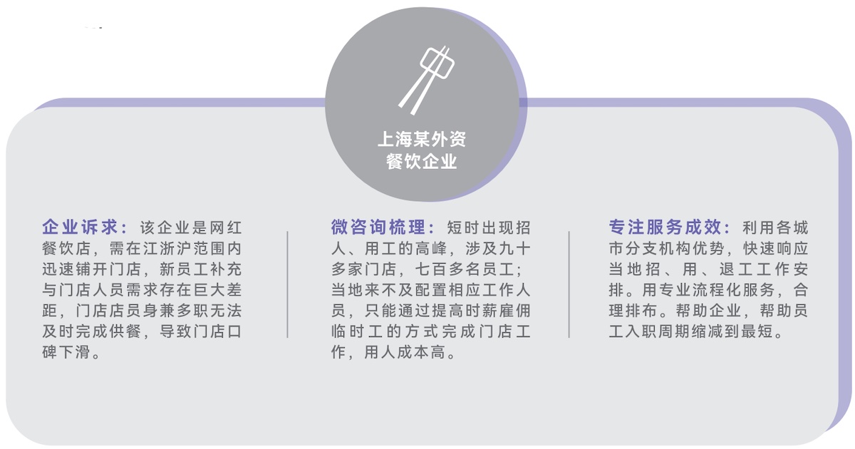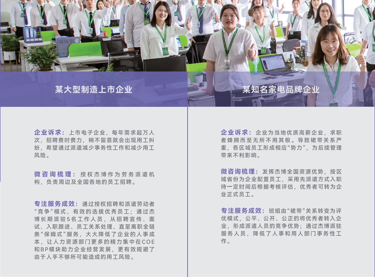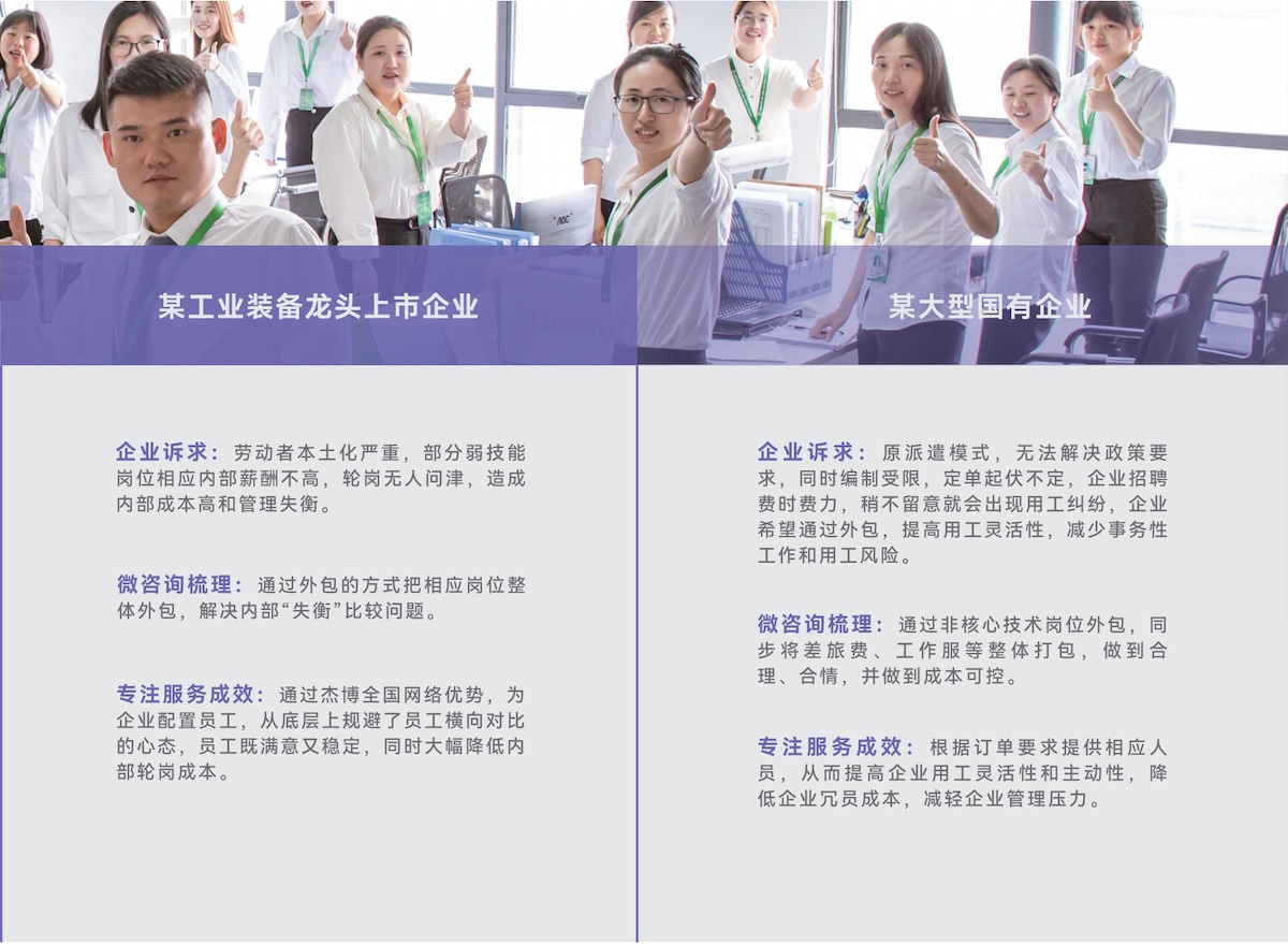 某24小時(shí)智能無人便利連鎖企業(yè)企業(yè)述求:新興無人零售模式,需要在全國范圍內(nèi)迅速鋪開零售點(diǎn)位,大批量且時(shí)間緊迫的招、用、退工給企業(yè)內(nèi)部HR部門帶來巨大工作壓力,希望通過采購專業(yè)的第三方服務(wù)提高工作效率,優(yōu)化用工成本。 微咨詢梳理:全國各地短時(shí)出現(xiàn)招、用、退工的高峰,涉及六十多個(gè)城市,三千多名員工;但企業(yè)當(dāng)?shù)厝肆Y源部門的缺失或是來不及配置相應(yīng)工作人員,導(dǎo)致社保等福利漏錯(cuò),勞動(dòng)合同、漏簽錯(cuò)簽等用工風(fēng)險(xiǎn)頻發(fā);企業(yè)總部人資部門對(duì)當(dāng)?shù)氐恼吡私獠怀浞郑瑹o法更高效的指導(dǎo)工作。 專注服務(wù)成效:杰博利用全國百余個(gè)分支機(jī)構(gòu)的優(yōu)勢(shì),快速響應(yīng)各城市的招、用、退工作安排,用專業(yè)流程化的服務(wù)把錯(cuò)漏降低到“零”;日清月報(bào)制度讓企業(yè)總部實(shí)時(shí)“掌控”各城市用工數(shù)據(jù),為企業(yè)高速發(fā)展做到真正的保駕護(hù)航。 | 某游戲開發(fā)企業(yè)企業(yè)述求:該企業(yè)規(guī)模不到百人,基本是游戲開發(fā)崗位,企業(yè)初創(chuàng)期,需要穩(wěn)定專業(yè)的人事處理員工基本用工事務(wù),比如勞動(dòng)合同簽訂、社保繳納、工資計(jì)算下發(fā);但人事崗位半年換了三人,交接期間多次出現(xiàn)因書面錯(cuò)誤導(dǎo)致的勞動(dòng)仲裁;企業(yè)希望通過采購專業(yè)的第三方服務(wù)降低相應(yīng)風(fēng)險(xiǎn)。 微咨詢梳理:人事崗工作瑣碎,但技術(shù)要求并不高,歷屆人事工作資歷偏淺,但招用老練的人事又超出了用工成本,企業(yè)管理層希望更聚焦的做研發(fā)提升企業(yè)活力。 專注服務(wù)成效:杰博配置專業(yè)的客服人員,用在線系統(tǒng)工具處理各項(xiàng)人事工作,把人力資源工作流程化、可視化!讓企業(yè)用低于市場(chǎng)人事專員的成本獲得更高效的服務(wù)結(jié)果! |